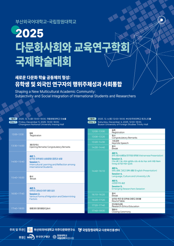 ºÎ»ê¿Ü±¹¾î´ëÇб³(ÃÑÀå Àå¼øÈï) ÀÌÁÖ´Ù¹®È¿¬±¸¼Ò´Â ±¹¸³Ã¢¿ø´ëÇб³(ÃÑÀå ¹Ú¹Î¿ø) ´Ù¹®ÈÁøÈï¼¾ÅÍ¿Í ¿À´Â 5ÀϺÎÅÍ ¾çÀϰ£ ¡®»õ·Î¿î ´Ù¹®È Çмú°øµ¿Ã¼ÀÇ Çü¼º: À¯Çлý ¹× ¿Ü±¹ÀÎ ¿¬±¸ÀÚÀÇ ÇàÀ§ÁÖü¼º°ú »çȸÅëÇÕ¡¯À» ÁÖÁ¦·Î 2025 ´Ù¹®È»çȸ¿Í ±³À°¿¬±¸ÇÐȸ ±¹Á¦Çмú´ëȸ¸¦ °³ÃÖÇÑ´Ù°í 4ÀÏ ¹àÇû´Ù.