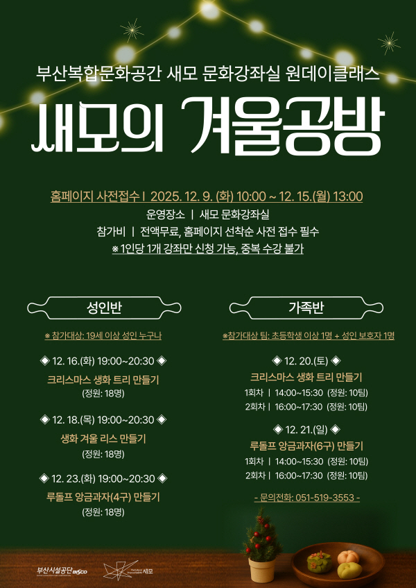 À̹ø Ŭ·¡½º´Â ¼ºÀιݰú °¡Á·¹ÝÀ¸·Î ±¸¼ºÇØ ÃÑ 7ȸ ÁøÇàµÇ¸ç, »ýÈ Å©¸®½º¸¶½º Æ®¸® ¸¸µé±â, ¸®½º Á¦ÀÛ, ·çµ¹ÇÁ ¾Ó±Ý°úÀÚ ÄíŷŬ·¡½º µî ½Ã¹ÎµéÀÌ Á÷Á¢ Âü¿©ÇÏ¸ç ¿Ï¼ºÇϴ üÇèÇü ÇÁ·Î±×·¥À¸·Î ²Ù·ÁÁ³´Ù. ¸ðÁý ÀοøÀº ÃÑ 134¸í(¼ºÀÎ 54¸í, °¡Á· 80¸í)À̸ç, 12¿ù 9ÀÏ È¿äÀÏ ¿ÀÀü 10½ÃºÎÅÍ 12¿ù 15ÀÏ ¿ù¿äÀÏ ¿ÀÈÄ 1½Ã±îÁö »õ¸ð ȨÆäÀÌÁö(https://saemo.bisco.or.kr)¿¡¼ ¼±Âø¼ø Á¢¼ö·Î ½ÅûÇÒ ¼ö ÀÖ´Ù.