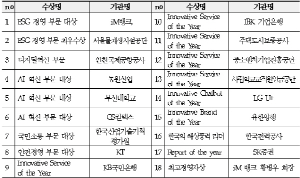 À̹ø ¡®2025 Çѱ¹ÀÇ °æ¿µ´ë»ó¡¯¿¡¼´Â AI Çõ½Å ºÎ¹®¿¡¼ ºÎ»ê´ë ¿Ü¿¡ ±â¾÷À¸·Î´Â µ¿¿ø»ê¾÷, GSĮŨ½º µîÀÌ ¼ö»óÇßÀ¸¸ç, ÀÎõ±¹Á¦°øÇ×°ø»ç¿Í IBK±â¾÷ÀºÇà, LG U+, Çѱ¹Àü·Â°ø»ç µî ÃÑ 17°³ ±â¾÷¡¤±â°ü(Management ¿µ¿ª 8°³, Practice ¿µ¿ª 8°³, Report ¿µ¿ª 1°³, ÃÖ°í°æ¿µÀÚ»ó 1°³)ÀÌ °¢ ºÎ¹®¿¡¼ ¼ö»óÇß´Ù.