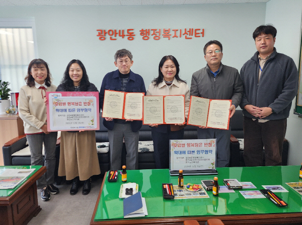 ºÎ»ê±¤¿ª½Ã ¼ö¿µ±¸ ±¤¾È4µ¿ ÇàÁ¤º¹Áö¼¾ÅÍ(µ¿Àå Á¤Àº¿¬)´Â 12¿ù 9ÀÏ ±¤¾È4µ¿Áö¿ª»çȸº¸ÀåÇùÀÇü(À§¿øÀå ±èÁ¾°©), ±¤¾È³ëÀκ¹Áö°ü(°üÀå ¼ÕÁ¤È¯)°ú Àú¼Òµæ ¾î¸£½ÅÀ» À§ÇÑ ¡¸È£¾Ï°ñ Çູ´ãÀº ¹ÝÂù¡¹»ç¾÷ È®´ë ¾÷¹«Çù¾àÀ» ü°áÇÏ¿´´Ù°í ¹àÇû´Ù.