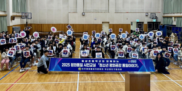 ¹ÎÁÖÆòÈÅëÀÏÀÚ¹®È¸ÀÇ ºÎ»ê¿µµµ±¸ÇùÀÇȸ(ȸÀå ±èâ¼®)´Â Áö³ 12¿ù 11ÀÏ µ¿»ïÃʵîÇб³ °´ç¿¡¼ 5¡¤6Çгâ ÃʵîÇлý 150¿© ¸íÀ» ´ë»óÀ¸·Î ¡®2025 ÆòÈÅëÀÏ ½Ã¹Î±³½Ç : û¼Ò³â ÆòȰø°¨ ÅëÀÏÀ̾߱⡯¸¦ °³ÃÖÇß´Ù.