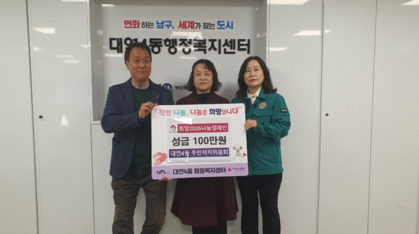 ´ë¿¬4µ¿ ÁÖ¹ÎÀÚÄ¡À§¿øÈ¸(À§¿øÀå ÃÖ¿µ½Ç)´Â Áö³ 12¿ù 15ÀÏ, ´ë¿¬4µ¿ ÇàÁ¤º¹Áö¼¾ÅÍ¿¡ ¡¸Èñ¸Á2026 ³ª´® Ä·ÆäÀΡ¹ ÀÌ¿ôµ½±â ¼º±Ý 100¸¸ ¿øÀ» ±âŹÇß´Ù°í ¹àÇû´Ù.