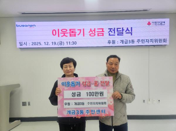 ºÎ»êÁø±¸ °³±Ý3µ¿ ÁÖ¹ÎÀÚÄ¡À§¿øÈ¸(À§¿øÀå ±èÁøÈ£)´Â °³±Ý3µ¿(µ¿Àå ±è¸íÈñ)¿¡ ÀÌ¿ôµ½±â ¼º±ÝÀ¸·Î 100¸¸ ¿øÀ» Àü´ÞÇß´Ù.