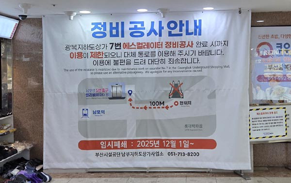 ÃâÀÔ±¸´Â Áö³­ 1ÀϺÎÅÍ Æó¼âµÈ »óÅ´Ù. ºÎ»ê½Ã¼³°ø´ÜÀÌ Áö³­ 10¿ù ÃâÀÔ±¸¿Í ÁöÇϵµ»ó°¡¸¦ ¿¬°áÇÏ´Â ¿¡½ºÄ÷¹ÀÌÅÍ °Ë»ç¸¦ ÇÏ´ø Áß ÇϺΠÁö¹Ý¿¡¼­ ´©¼ö¸¦ ¹ß°ß, ¾ÈÀü»ç°í ¿¹¹æÀ» À§ÇØ ÀÌ¿ëÀ» ÁߴܽÃÄ×´Ù. ÀÌ¿¡ °ø´Ü ÃøÀº 7¹ø ÃâÀÔ±¸¿¡¼­ 100£í ¶³¾îÁø 5¹ø ÃâÀÔ±¸¸¦ ÀÌ¿ëÇÒ °ÍÀ» ¾È³»(»çÁø)Çϰí ÀÖ´Ù.