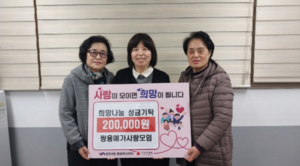 ºÎ»ê ³²±¸ ¿ëÈ£4µ¿¿¡ À§Ä¡ÇÑ ½Ö¿ë¿¹°¡¾ÆÆÄÆ® ÁֹΠ¸ðÀÓÀÎ ¡®½Ö¿ë¿¹°¡»ç¶û¸ðÀÓ¡¯(ȸÀå Á¶Çö¼÷)Àº Áö³ 30ÀÏ ¿ëÈ£4µ¿ ÇàÁ¤º¹Áö¼¾ÅÍ(µ¿Àå À̹ÌÇâ)¿¡ ¡®¿À·úµµ 5,600¿ø Èñ¸Á³ª´®¡¯»ç¾÷À» À§ÇÑ ¼º±Ý 20¸¸¿øÀ» ±âŹÇß´Ù.