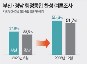 ºÎ»ê¡¤°æ³² ÇàÁ¤ÅëÇÕ°ø·ÐÈÀ§¿øÈ¸´Â 5ÀÏ ¹ßÇ¥ÇÑ ¿©·ÐÁ¶»ç °á°ú ÇàÁ¤ÅëÇÕÀÌ ¡®ÇÊ¿äÇÏ´Ù¡¯´Â ÀǰßÀº 53.7%·Î, ¡®ºÒÇÊ¿äÇÏ´Ù¡¯´Â Àǰß(29.2%)À» ¾ÐµµÇß´Ù. ÀÌ´Â 2023³â 1Â÷ Á¶»ç ´ç½Ã Âù¼º(35.6%)º¸´Ù ¹Ý´ë(45.6%)°¡ ³ô¾Ò´ø °á°ú¸¦ ¿ÏÀüÈ÷ µÚÁýÀº °ÍÀÌ´Ù. ƯÈ÷ ÇàÁ¤ÅëÇÕ¿¡ ´ëÇÑ ÀÎÁöµµ°¡ 55.8%¸¦ ±â·ÏÇÏ¸ç ±Þ»ó½Â(30.6%¡æ55.8%)ÇØ, Áö¿ª »ýÁ¸À» À§ÇÑ ÅëÇÕ ³íÀǰ¡ ½Ã¡¤µµ¹ÎÀÇ »î ¼Ó¿¡ ±í¼÷ÀÌ Ä§ÅõÇßÀ½À» º¸¿©Áá´Ù.