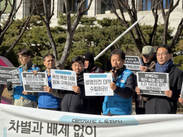 ¹ÎÁÖ³ëÃÑ Àü±¹¼ºñ½º»ê¾÷³ëµ¿Á¶ÇÕ¿¬¸Í Àü±¹´ë¸®¿îÀü³ëµ¿Á¶ÇÕÀº 6ÀÏ ¿ÀÀü ºÎ»ê½Ãû Á¤¹® ¾Õ¿¡¼ ±âÀÚȸ°ßÀ» ¿°í ´ë¸®±â»ç ½É¾ß À̵¿ ¾ÈÀü´ëÃ¥ µî Á¤ºÎ¡¤ÁöÀÚü Â÷¿ø¿¡¼ Ưº°´ëÃ¥À» ¸¶·ÃÇÒ °ÍÀ» ¿ä±¸Çß´Ù. ÀÌ¿Í ÇÔ²² ¢¹Â÷º° ¾ø´Â »ê¾÷¾ÈÀüº¸°Ç¹ý Àû¿ë ¢¹±¹Á¦³ëµ¿±â±¸(ILO) 190È£ Çù¾à Áï°¢ ºñÁØ ¢¹´ë¸®¿îÀü »ç¾÷ÁÖ¿Í Ç÷§ÆûÀÇ ¾ÈÀü Àǹ« ¸í¹®È µîµµ ¿ä±¸Çß´Ù.