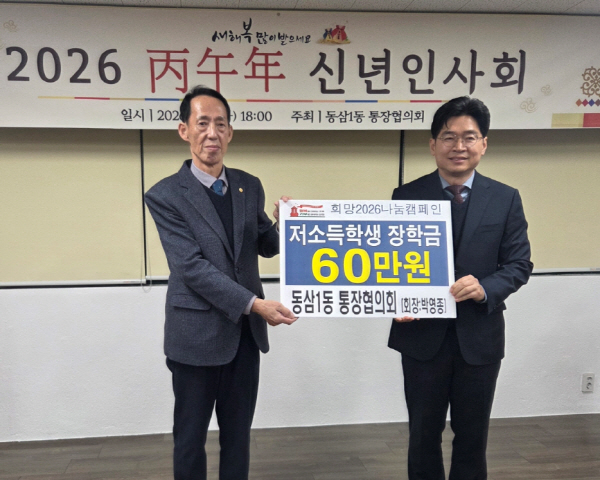 µ¿»ï1µ¿ ÅëÀåÇùÀÇȸ(ȸÀå ¹Ú¿µÁ¾)´Â Áö³ 1¿ù 6ÀÏ °³ÃÖµÈ ¡®2026³â º´¿À³â ½Å³âÀλçȸ¡¯¿¡¼ Áö¿ª Àú¼ÒµæÃþ ÇлýµéÀ» Áö¿øÇϱâ À§ÇÑ ÀåÇÐ±Ý 60¸¸ ¿øÀ» µ¿»ï1µ¿ ÇàÁ¤º¹Áö¼¾ÅÍ¿¡ Àü´ÞÇß´Ù.