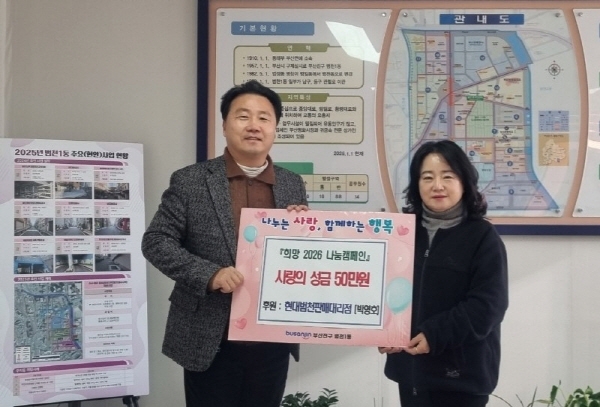 ºÎ»êÁø±¸ Çö´ë¹üõÆÇ¸Å´ë¸®Á¡(´ëÇ¥ ¹Ú¿µÈ£)Àº Áö¿ª ³» ¾î·Á¿î ÀÌ¿ôÀ» µ½°íÀÚ ¹üõ1µ¿ Áֹμ¾ÅÍ(µ¿Àå ±èÁÖ¿µ)¿¡ ÀÌ¿ôµ½±â ¼º±Ý 50¸¸¿øÀ» ±âŹÇß´Ù.