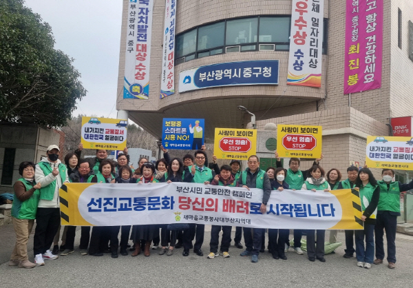 ºÎ»ê±¤¿ª½ÃÁß±¸»õ¸¶À»È¸(ȸÀå ÀÌÇü¸ñ)´Â Áö³­ 19ÀÏ Áß±¸Ã» ¾Õ¿¡¼­ ¡®ºÎ»ê½Ã¹Î ±³Åë¾ÈÀü Ä·ÆäÀΡ¯À» ÆîÃÆ´Ù. ȸ¿øµéÀº Çö¼ö¸·°ú ÇÇÄÏÀ» ÀÌ¿ëÇØ ½Ã¹Îµé¿¡°Ô ±³Åë¹ý±Ô ÁؼöÀÇ Á߿伺À» ¾Ë¸®°í, ¾ÈÀüÇÑ º¸Çàȯ°æ Á¶¼º¿¡ Àû±Ø µ¿ÂüÇØ ÁÙ °ÍÀ» ´çºÎÇß´Ù.