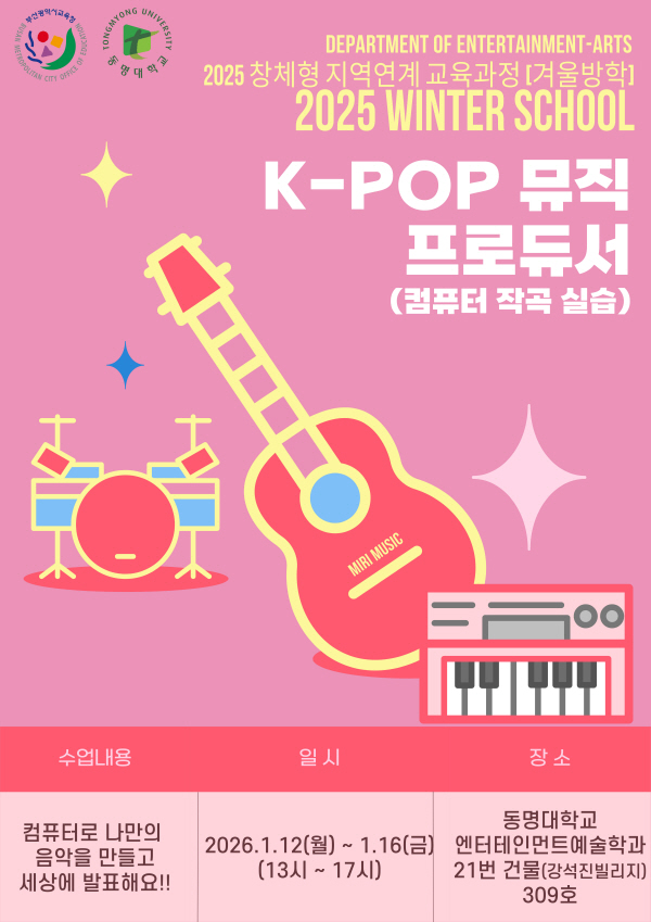 µ¿¸í´ë ¿£ÅÍÅ×ÀÎ¸ÕÆ®¿¹¼úÇаú´Â ºÎ¡¤¿ï¡¤°æ Áö¿ª¿¡¼ À¯ÀÏÇÏ°Ô K-Pop ÇÁ·Îµà½Ì°ú µðÁöÅÐ °ø¿¬¿¹¼úÀ» ÇÔ²² ´Ù·ç´Â Àü°øÀ¸·Î, AI À½¾Ç, ÄÄÇ»ÅÍ ÀÛ°î, ÄÜÅÙÃ÷ Á¦ÀÛ ±³À°À» ÅëÇØ Áö¿ª ±â¹Ý K-Culture ÀÎÀç ¾ç¼º¿¡ Èû¾²°í ÀÖ´Ù.
