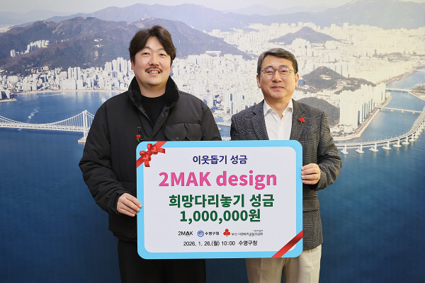 ºÎ»ê±¤¿ª½Ã ¼ö¿µ±¸(±¸Ã»Àå °­¼ºÅÂ)´Â 26ÀÏ(¿ù)±¸Ã»Àå½Ç¿¡¼­ ¼ö¿µ±¸ Èñ¸Á´Ù¸®³õ±â»ç¾÷ÀÇ ÀÏȯÀ¸·Î µðÀÚÀÎ ¾÷üÀÎ 2MAK design(´ëÇ¥ Ãֹ̼®)À¸·ÎºÎÅÍ Áö¿ø¼º±Ý 100¸¸¿øÀ» ±âŹ ¹Þ¾Ò´Ù.