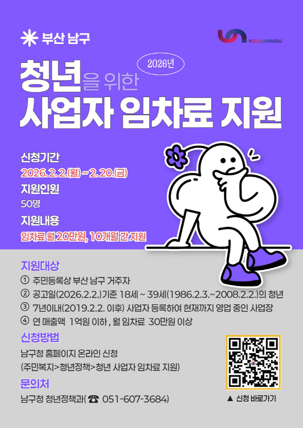 ºÎ»ê ³²±¸(±¸Ã»Àå ¿ÀÀºÅÃ)´Â û³â â¾÷ÀÚÀÇ Ãʱ⠰濵 ºÎ´ãÀ» ¿ÏÈÇÏ°í ¾ÈÁ¤ÀûÀÎ Áö¿ª Á¤ÂøÀ» Áö¿øÇϱâ À§ÇØ ¡¸2026³â û³â »ç¾÷ÀÚ ÀÓÂ÷·á Áö¿ø»ç¾÷¡¹À» ÃßÁøÇÑ´Ù°í ¹àÇû´Ù.