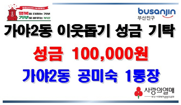 ºÎ»ê ºÎ»êÁø±¸ °¡¾ß2µ¿ 1ÅëÀå(°ø¹Ì¼÷)Àº 27ÀÏ ¾î·Á¿î ÀÌ¿ôÀ» µ½±â À§ÇØ ¼º±Ý 10¸¸ ¿øÀ» °¡¾ß2µ¿ Áֹμ¾ÅÍ(µ¿Àå ±è¿µ¹Ì)¿¡ ±âŹÇß´Ù.