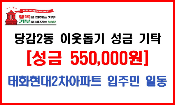 ºÎ»êÁø±¸ ´ç°¨2µ¿ ÅÂÈÇö´ë2Â÷¾ÆÆÄÆ® ÀÔÁֹΠÀϵ¿Àº 1¿ù 27ÀÏ ´ç°¨2µ¿ Áֹμ¾ÅÍ(µ¿Àå ¼Û°æ¼÷)¿¡ ÀÌ¿ôµ½±â ¼º±Ý 550,000 ¿øÀ» ±âŹÇÏ¿´´Ù.
