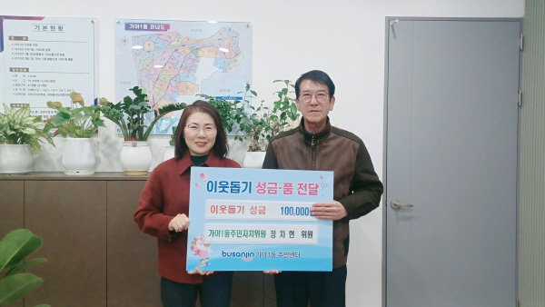 ºÎ»êÁø±¸ °¡¾ß1µ¿ Á¤Â÷Çö ÁÖ¹ÎÀÚÄ¡À§¿øÀº Áö³ 28ÀÏ °¡¾ß1µ¿ Áֹμ¾ÅÍ(µ¿Àå ½Åº¸¹Î)¸¦ ¹æ¹®ÇÏ¿© ÀÌ¿ôµ½±â ¼º±Ý 10¸¸ ¿øÀ» ±âŹÇÏ¿´´Ù.