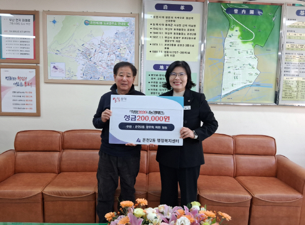 ºÎ»ê µ¿·¡±¸ ¿Âõ2µ¿ ÇàÁ¤º¹Áö¼¾ÅÍ(µ¿Àå ±èºÐ¿Á)´Â Áö³ 27ÀÏ ¿Âõ2µ¿ »ó¿ìȸ(ȸÀå Á¶¼öÁ¦)·ÎºÎÅÍ ÀÌ¿ô»ç¶ûÀ» ½ÇõÇϱâ À§ÇÑ ¼º±Ý 20¸¸ ¿øÀ» Àü´Þ¹Þ¾Ò´Ù°í ¹àÇû´Ù.
