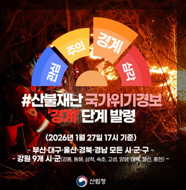 ÃÖ±Ù µ¿ÇؾȰú ¿µ³² Áö¿ªÀÇ »êºÒ À§ÇèÀÌ Ä¿Áü¿¡ µû¶ó 2026³â 1¿ù 27ÀÏ(È) ¿ÀÈÄ 5½Ã¸¦ ±âÇØ ºÎ»ê, ´ë±¸, ¿ï»ê, °æºÏ, °æ³² Áö¿ª°ú °¿øµµÀÇ 9°³ ½Ã±º(°¸ª, µ¿ÇØ, »ïô, ¼ÓÃÊ, °í¼º, ¾ç¾ç, Źé, Á¤¼±, ȫõ)ÀÇ »êºÒÀç³ ±¹°¡À§±â°æº¸°¡ ±âÁ¸ ¡®ÁÖÀÇ¡¯ ´Ü°è¿¡¼ ¡®°æ°è¡¯ ´Ü°è·Î »óÇâµÇ¾ú´Ù.
