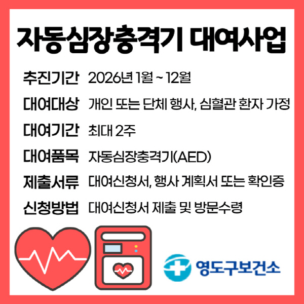 ¿µµµ±¸º¸°Ç¼Ò(¼ÒÀå ¹Ú¼º·ü)´Â ±Þ¼º ½ÉÀåÁ¤Áö µî ÀÀ±Þ »ç°í ¹ß»ý ½Ã ±¸¹ÎÀÇ »ý¸íÀ» º¸È£ÇÏ°í °ñµçŸÀÓÀ» È®º¸Çϱâ À§ÇØ ¡®2026³â À̵¿Çü ÀÚµ¿½ÉÀåÃæ°Ý±â(AED) ¹«»ó ´ë¿© »ç¾÷¡¯À» ½ÃÇàÇÑ´Ù.
