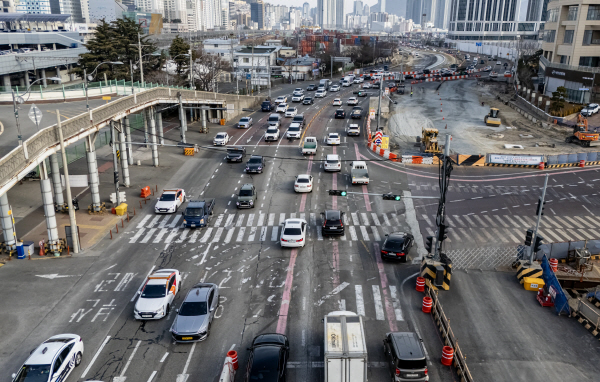 Àü¹æ¿¡ ÃæÀå·Î ÁöÇÏÂ÷µµ °ø»ç ÇöÀåÀÌ º¸ÀÌ´Â ÁöÁ¡¿¡¼­ Æíµµ 5Â÷·ÎÀÌ´ø Â÷·Î°¡ 3Â÷·Î·Î ÁÙ¾îµé¸é¼­ °í°¡±³¸¦ ³»·Á°¡±â ÀüºÎÅÍ Â÷·® Çà·ÄÀÌ ±æ°Ô ´Ã¾î¼¹´Ù.