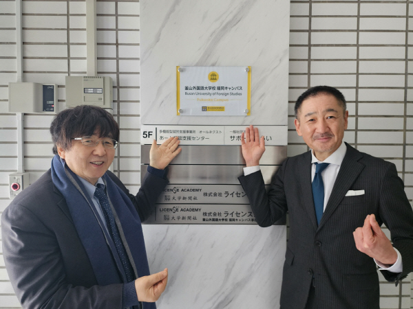 | ºÎ»ê¿Ü´ë Àå¼øÈï ÃÑÀå(¿ÞÂÊ)°ú ¢ß¶óÀ̼¾½º¾ÆÄ«µ¥¹Ì Matsubara Jun ´ëÇ¥ÀÌ»ç(¿À¸¥ÂÊ)°¡ ÇöÆÇ ±â³ä »çÁøÀ» ÃÔ¿µÇϰí ÀÖ´Ù.