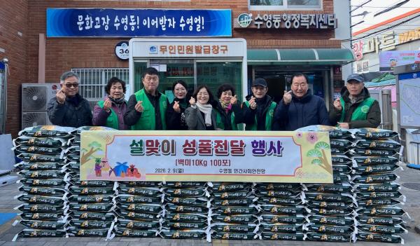 ¼ö¿µµ¿ ¹Î°£»çȸ¾ÈÀü¸ÁÀº ÁֹεéÀÇ ÈÄ¿ø±ÝÀ» ¸ð¾Æ ¸Å³â ¸íÀýÀ» Æ÷ÇÔÇÏ¿© ¿¬¸», °¡Á¤ÀÇ ´Þ µî ²ÙÁØÈ÷ ÀÌ¿ô»ç¶û ³ª´®À» ½ÇõÇϰí ÀÖÀ¸¸ç, À̹ø ¼³³¯ ¸íÀý¿¡µµ °ü³» Àú¼Òµæ ÁֹεéÀÇ ½Ä»ýȰÀ» Áö¿øÇϱâ À§ÇØ ¹é¹Ì 10kg 100Æ÷¸¦ ÈÄ¿øÇß´Ù.