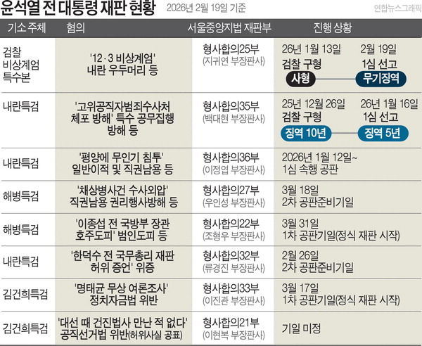 19ÀÏ ¹«±â¡¿ªÀ» ¼±°í¹ÞÀº À±¼®¿ Àü ´ëÅë·ÉÀº ¾Õ¼ ¡¿ª 5³âÀ» ¼±°í¹ÞÀº üÆ÷¹æÇØ »ç°Ç°ú À̳¯ »ç°Ç ¿Ü¿¡µµ 6°³ »ç°ÇÀÌ 1½ÉÀ» ¾ÕµÎ°í ÀÖ´Ù. À± Àü ´ëÅë·ÉÀÌ ¹Þ´Â ÀçÆÇÀº ¸ðµÎ 8°ÇÀÌ´Ù. °¡Àå ¸ÕÀú ¹ý¿ø ÆÇ´ÜÀÌ ³ª¿Â °ÇÀº üÆ÷¹æÇØ ÇøÀÇ »ç°ÇÀÌ´Ù. Áö³´Þ 16ÀÏ ¼¿ïÁß¾ÓÁö¹ý Çü»çÇÕÀÇ35ºÎ(¹é´ëÇö ÀçÆÇÀå)´Â ¡°´©±¸º¸´Ù Çå¹ýÀ» ¼öÈ£ÇØ¾ß ÇÒ ´ëÅë·ÉÀÌ ±× Àǹ«¸¦ Àú¹ö·È´Ù¡±¸ç ±×¿¡°Ô ¡¿ª 5³âÀ» ¼±°íÇß´Ù. ³»¶õ »ç°Ç º»·ùÀÎ À̳¯ ³»¶õ ¿ìµÎ¸Ó¸® ÇøÀÇ ÀçÆÇ¿¡¼± ¹«±â¡¿ªÀÌ ³ª¿Ô´Ù.
