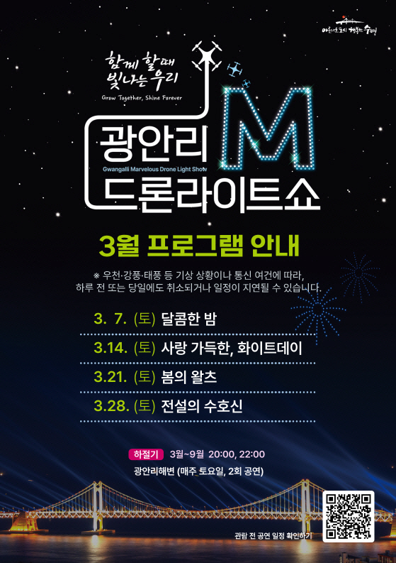 ºÎ»ê±¤¿ª½Ã ¼ö¿µ±¸(±¸Ã»Àå °¼ºÅÂ)´Â ¸ÅÁÖ Åä¿äÀÏ Àú³á 1,000´ë ±Ô¸ðÀÇ ¡¸±¤¾È¸® M µå·Ð¶óÀÌÆ®¼î¡¹¸¦ »ó¼³·Î °³ÃÖ ÁßÀ̸ç 3¿ù¿¡µµ °èÀýÀÇ º¯È¿Í Ưº°ÇÑ ±â³äÀÏÀ» ÁÖÁ¦·Î ´Ù¾çÇÑ °ø¿¬À» ¼±º¸ÀÏ ¿¹Á¤ÀÌ´Ù.