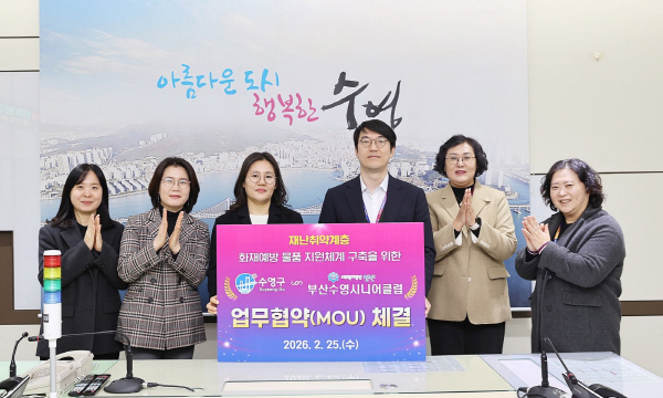 ºÎ»ê±¤¿ª½Ã ¼ö¿µ±¸(±¸Ã»Àå °¼ºÅÂ)´Â 2026³â 2¿ù 25ÀÏ, ¼ö¿µ±¸Ã» Àç³¾ÈÀü»óȲ½Ç¿¡¼ »çȸº¹Áö¹ýÀΠûÀü ºÎ»ê¼ö¿µ½Ã´Ï¾îŬ·´(°üÀå ÀÌÁÖ¹Ì)°ú ¡ºÀç³Ãë¾à°èÃþ ÈÀ翹¹æ ¹°Ç° Áö¿øÃ¼°è ±¸ÃàÀ» À§ÇÑ ¾÷¹«Çù¾à(MOU)¡»À» ü°áÇß´Ù°í ¹àÇû´Ù.