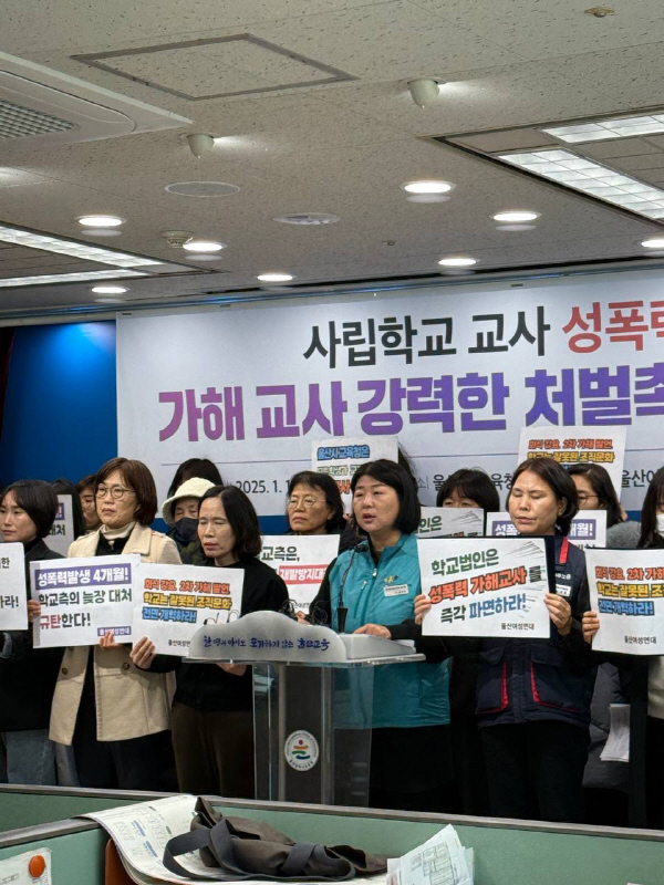 ¿ï»ê¿©¼º¿¬´ë µî ¿ï»êÁö¿ª ¿©¼º´Üü ȸ¿øµéÀÌ Áö³­ 1¿ù12ÀÏ ¿ï»ê½Ã±³À°Ã» ÇÁ·¹½º¼¾ÅÍ¿¡¼­ ¿ï»ê ÇÑ »ç¸³Çб³ °£ºÎ±³»çÀÇ ¼ºÆø·Â »ç°Ç°ú °ü·ÃÇØ ó¹ú°ú Àç¹ß ¹æÁö¸¦ Ã˱¸ÇÏ´Â ±âÀÚȸ°ßÀ» Çϰí ÀÖ´Ù. ±¹Á¦½Å¹®DB