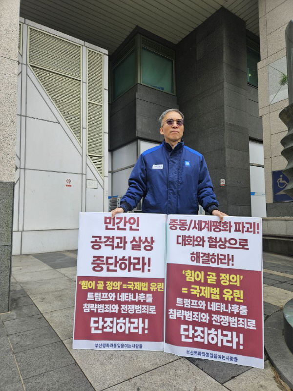 ¡®ºÎ»ê ÆòÈ¿Í ÅëÀÏÀ» ¿©´Â »ç¶÷µé(ÆòÅë»ç)¡¯Àº 3ÀÏ ¿ÀÀü ºÎ»êÁø±¸ ÁÖºÎ»ê ¹Ì±¹¿µ»ç°ü ¾Õ¿¡¼ ¹Ì±¹°ú À̽º¶ó¿¤ÀÇ À̶õ °ø°ÝÀ» Áß´ÜÇ϶ó´Â ÃëÁöÀÇ 1ÀÎ ½ÃÀ§¸¦ ÁøÇàÇß´Ù. À̵éÀº ¿µ»ç°ü ¾Õ¿¡¼ ¹Ì±¹°ú À̽º¶ó¿¤ÀÇ ±º»ç ÀÛÀüÀÌ Ä§·« ¹üÁË¿¡ ÇØ´çÇϹǷÎ, ¹Î°£ÀÎ °ø°Ý°ú »ì»óÀ» Áï°¢ ¸ØÃß¶ó´Â ³»¿ëÀÇ ÇÇÄÏÀ» µé¸ç 1ÀÎ ½ÃÀ§¸¦ 1½Ã°£°¡·® ÀÌ¾î ³ª°¬´Ù.