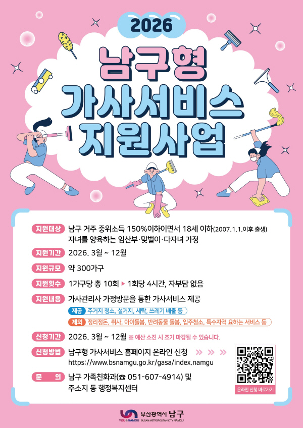 ºÎ»ê ³²±¸´Â ÀÓ»êºÎ¡¤¸Â¹úÀÌ¡¤´ÙÀÚ³à °¡Á¤ÀÇ °¡»ç ºÎ´ãÀ» ¿ÏÈÇϱâ À§ÇØ ¡¸2026³â ³²±¸Çü °¡»ç¼ºñ½º Áö¿ø»ç¾÷¡¹À» 3¿ù 9ÀϺÎÅÍ ½ÃÇàÇÑ´Ù°í ¹àÇû´Ù.