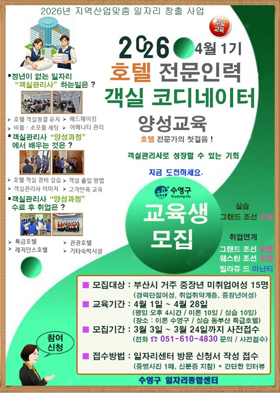 ºÎ»ê±¤¿ª½Ã ¼ö¿µ±¸(±¸Ã»Àå °¼ºÅÂ)¿¡¼´Â 2026³â ºÎ»ê±¤¿ª½Ã ±¸¡¤±º ¸ÂÃãÇü ÀÏÀÚ¸® âÃâ Áö¿ø»ç¾÷À¸·Î °ø¸ð ¼±Á¤µÈ ¡®È£ÅÚ Àü¹®Àη °´½ÇÄÚµð ¾ç¼º»ç¾÷¡¯À» ÃßÁøÇÑ´Ù°í ¹àÇû´Ù.