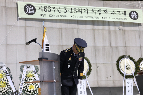 Á¦66ÁÖ³â 3¡¤15Àǰбâ³äÀÏÀ» ÇÏ·ç ¾ÕµÐ 14ÀÏ ¿ÀÀü °æ³² â¿ø½Ã ¸¶»êȸ¿ø±¸ ±¹¸³ 3¡¤15 ¹ÎÁÖ¹¦Áö¿¡¼­ ¿­¸° ¡®3¡¤15ÀǰŠÈñ»ýÀÚ Ã߸ðÁ¦¡¯¿¡¼­ ±èÁ¾Ã¶ °æ³²°æÂûûÀåÀÌ °æÂû ´ëÇ¥·Î Èñ»ýÀÚ¿Í À¯Á·¿¡ »ç°úÀÇ ¶æÀ» ÀüÇϰí ÀÖ´Ù. ¿¬ÇÕ´º½º