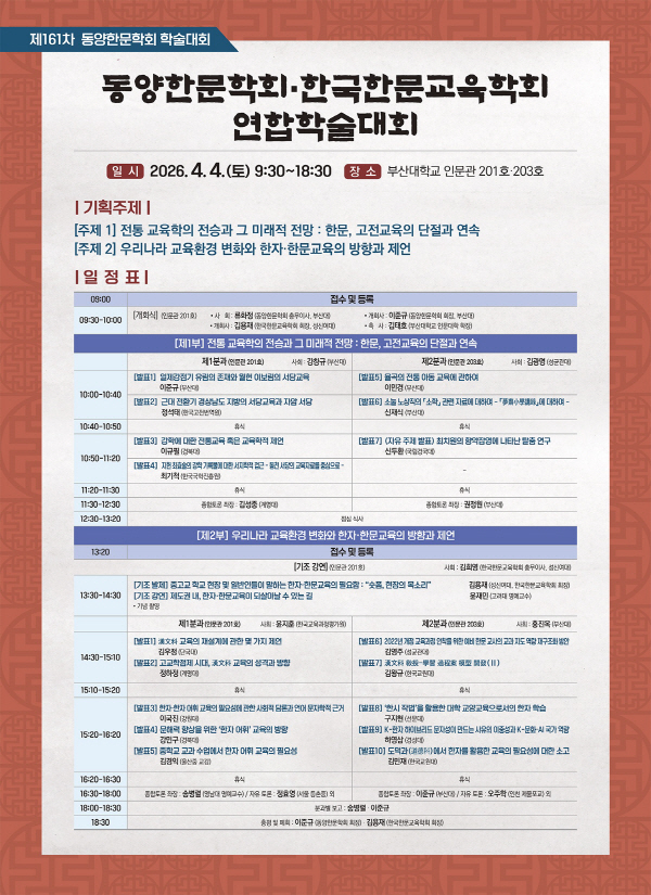 µ¿¾çÇѹ®ÇÐȸ(ÇÐȸÀå ÀÌÁرԡ¤ºÎ»ê´ë Çѹ®Çаú ±³¼ö)´Â Çѱ¹Çѹ®±³À°ÇÐȸ(ÇÐȸÀå ±è¿ëÀ硤¼º½Å¿©´ë ±³¼ö)¿Í °øµ¿À¸·Î ¿À´Â ´ÙÀ½´Þ 4ÀÏ ¿ÀÀü 9½Ã 30ºÐºÎÅÍ ºÎ»ê´ë Àι®°ü(201È£, 203È£)¿¡¼ ¡®¿¬ÇÕÇмú´ëȸ¡¯¸¦ °³ÃÖÇÑ´Ù.