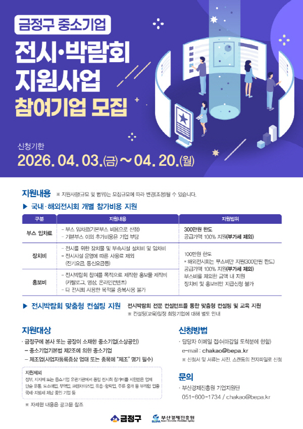±ÝÁ¤±¸°¡ »ç¾÷À» ÁÖ°üÇϰí (Àç)ºÎ»ê°æÁ¦ÁøÈï¿øÀÌ ¼öÇàÇϸç Áö¿ø ´ë»óÀº ±ÝÁ¤±¸¿¡ º»»ç ¶Ç´Â °øÀåÀ» µÐ Á¦Á¶ Áß¼Ò±â¾÷(¼Ò»ó°øÀÎ)ÀÌ´Ù. ¼±Á¤ ±â¾÷Àº ±â¾÷´ç ÃÖ´ë 300¸¸ ¿ø Çѵµ ³»¿¡¼ ±¹³»¿Ü Àü½Ã¹Ú¶÷ȸ Âü°¡¿¡ ÇÊ¿äÇÑ ºñ¿ëÀ» Áö¿ø¹ÞÀ» ¼ö ÀÖ´Ù.