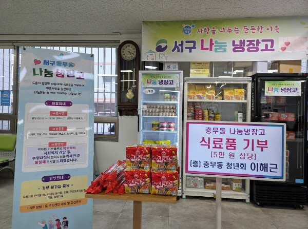ºÎ»ê ¼±¸ Ãæ¹«µ¿ ÀÌÇØ±Ù(û³âȸ ȸ¿ø) ¾¾´Â Áö³ 31ÀÏ ³ª´® ³ÃÀå°í¿¡ 5¸¸ ¿ø »ó´çÀÇ ½Ä·áǰÀ» ±âºÎÇÏ¸ç µû¶æÇÑ ³ª´®À» ½ÇõÇß´Ù.
