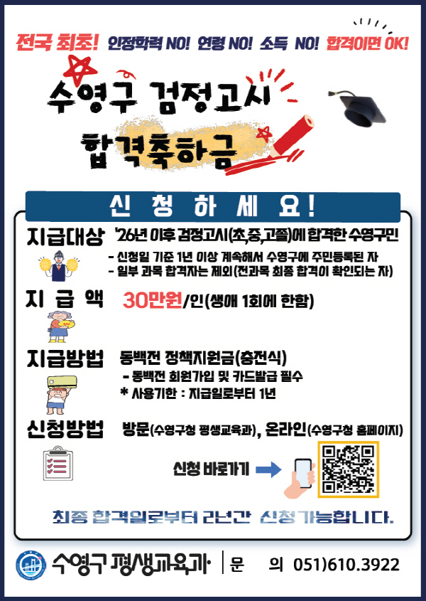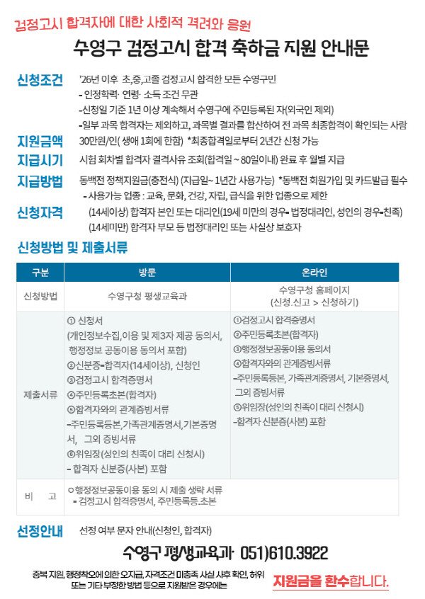 ºÎ»ê±¤¿ª½Ã ¼ö¿µ±¸(±¸Ã»Àå ±ÇÇÑ´ëÇà Á¤¿µ¶õ)´Â Áö³ 4¿ù 4ÀÏ¿¡ ½ÃÇàÇÑ 2026³âµµ Á¦1ȸ ÃÊ¡¤Áß¡¤°íÁ¹ °ËÁ¤°í½Ã ÇÕ°ÝÀÚ¸¦ ´ë»óÀ¸·Î ¡®°ËÁ¤°í½Ã ÇÕ°ÝÃàÇÏ±Ý Áö¿ø¡¯ ½ÅûÀ» ¹Þ´Â´Ù°í ¹àÇû´Ù.