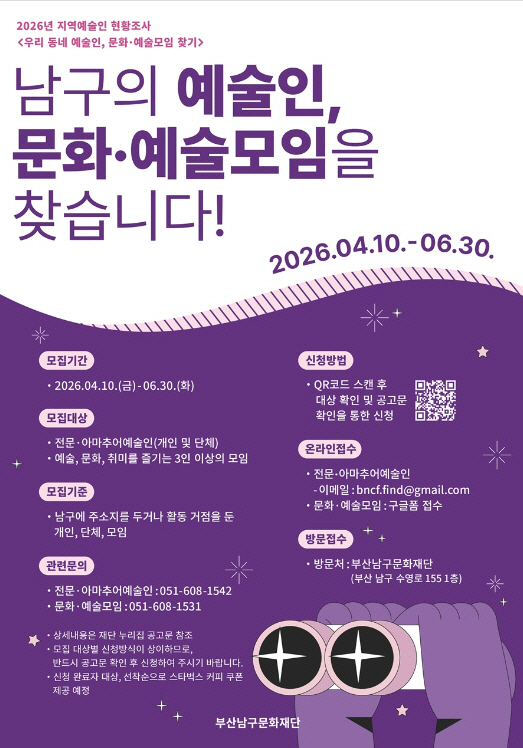 ºÎ»ê³²±¸¹®ÈÀç´Ü(ÀÌ»çÀå ±èö)Àº 4¿ù 10ÀϺÎÅÍ ºÎ»ê ³²±¸ Áö¿ª ¿¹¼úÀΰú ¹®È¡¤¿¹¼ú¸ðÀÓ ÇöȲÀ» ÆÄ¾ÇÇϱâ À§ÇÑ ¡¸¿ì¸® µ¿³× ¿¹¼úÀÎ, ¹®È¡¤¿¹¼ú¸ðÀÓ Ã£±â¡¹ Á¶»ç¸¦ ½Ç½ÃÇÑ´Ù°í ¹àÇû´Ù.