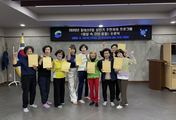 ºÎ»ê ¼­±¸ µ¿´ë½Å2µ¿ ÁÖ¹ÎÀÚÄ¡À§¿øÈ¸(À§¿øÀå ±èÁø¼ö)´Â Áö³­ 16ÀÏ ÁÖ¹ÎÀÚÄ¡ ÇÁ·Î±×·¥À¸·Î ÁøÇàÇß´ø <ÀÏ»ó ¼Ó °£´Ü¿îµ¿> ÇÁ·Î±×·¥ ¼ö·á½ÄÀ» °³ÃÖÇÏ¿´´Ù. °­ÀǸ¦ ¼ö·áÇÑ ¼ö°­»ýÀº ¡°½Ç»ýȰ¿¡¼­ µû¶óÇϱâ ÁÁÀº °£´ÜÇÑ ¿îµ¿À» ¹è¿öº¼ ¼ö À־ ÁÁ¾Ò´Ù¡±°í ¸»Çß´Ù.