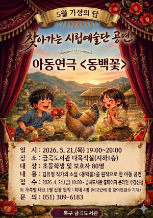 ºÎ»ê ºÏ±¸´Â ¿À´Â 5¿ù 21ÀÏ Àú³á 7½Ã, 5¿ù °¡Á¤ÀÇ ´ÞÀ» ¸Â¾Æ ±Ý°îµµ¼°ü¿¡¼ Áö¿ª ÁÖ¹ÎÀ» ´ë»óÀ¸·Î ±èÀ¯Á¤ ÀÛ°¡ÀÇ ´ÜÆí¼Ò¼³ ¡®µ¿¹é²É¡¯À» ¿øÀÛÀ¸·Î ÇÑ ¾Æµ¿¿¬±Ø °ø¿¬À» °³ÃÖÇÑ´Ù°í ¹àÇû´Ù.