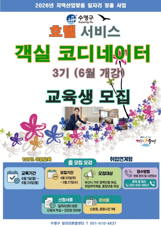 ºÎ»ê±¤¿ª½Ã ¼ö¿µ±¸(±¸Ã»Àå ±ÇÇÑ´ëÇà Á¤¿µ¶õ)´Â 2026³â ºÎ»ê±¤¿ª½Ã ±¸¡¤±º ¸ÂÃãÇü ÀÏÀÚ¸®Ã¢Ãâ Áö¿ø»ç¾÷À¸·Î °ø¸ð ¼±Á¤µÈ ¡®È£ÅÚ Àü¹®Àη °´½ÇÄÚµð ¾ç¼º»ç¾÷¡¯ 3±â ±³À°»ýÀ» ¸ðÁýÇÑ´Ù°í ¹àÇû´Ù.