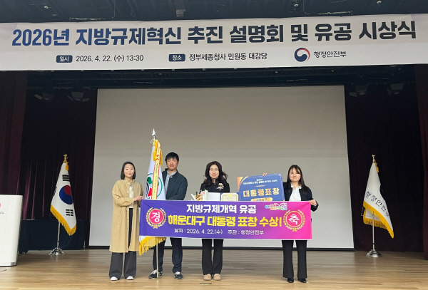 ÇØ¿î´ë±¸´Â ÇàÁ¤¾ÈÀüºÎ ÁÖ°ü¡®2025³â Áö¹æ±ÔÁ¦Çõ½Å ÃßÁø ¼º°úÆò°¡¡¯¿¡¼ ¿ì¼öÇÑ ¼º°ú¸¦ ÀÎÁ¤¹Þ¾Æ Áö³ 22ÀÏ Áö¹æ±ÔÁ¦°³Çõ À¯°ø ´ëÅë·É ǥâÀ» ¼ö»óÇÏ¿´´Ù.