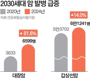 ÃÖ±Ù 20, 30´ëÀÇ ÀþÀº ¿¬·É´ë¿¡¼­µµ ¾Ï ¹ßº´ÀÌ ²ÙÁØÈ÷ Áõ°¡¼¼¸¦ º¸ÀÌ´Â °ÍÀ¸·Î ³ªÅ¸³µ´Ù. 9ÀÏ °Ç°­º¸Çè½É»çÆò°¡¿ø Åë°è¿¡ ÀÇÇϸé 2024³â ±âÁØ 20, 30´ë °©»ó¼±¾Ï ȯÀÚ´Â 6¸¸1241¸íÀ¸·Î, 2020³â ´ëºñ 14% Áõ°¡Çß´Ù. ÇØ´ç ³ªÀÌ´ë¿¡¼­ ´ëÀå¾ÏÀº ȯÀÚ ¼ö°¡ 6599¸íÀ» ±â·Ï, 4³â »õ 81.6% ±ÞÁõÇß´Ù.