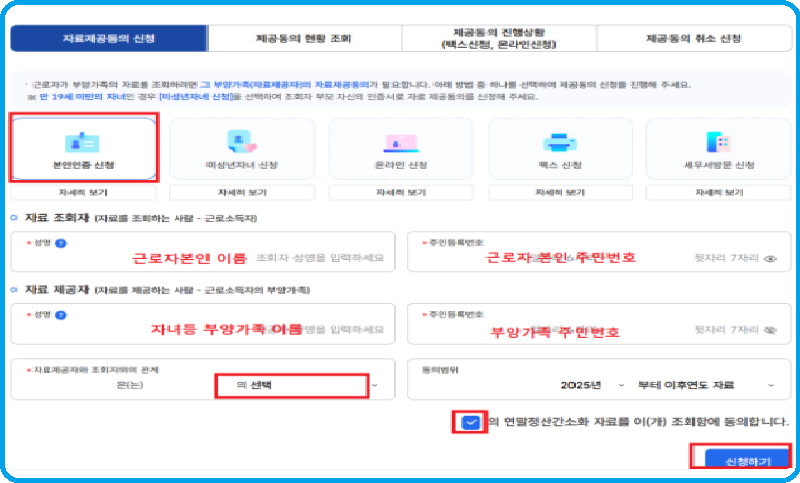 ¿¬¸»Á¤»ê¿¡¼­ ½Å¿ëÄ«µå ¼Òµæ°øÁ¦´Â ±âº»°øÁ¦(ÀÎÀû°øÁ¦)¿Í´Â ´Þ¸® ³ªÀÌÁ¦ÇÑÀÌ ¾ø±â ¶§¹®¿¡ ¼Òµæ¿ä°Ç¸¸ ÃæÁ·ÇÑ´Ù¸é °øÁ¦°¡ °¡´ÉÇÏ´Ù. ÀÚ³àÀÇ °æ¿ì ´ëÇлýÀ̰ųª ±º º¹¹« ÁßÀÎ ¾ÆµéÀ̰í, ¸¸ 20¼¼¸¦ ÃʰúÇÏ´õ¶óµµ °øÁ¦¸¦ ¹ÞÀ» ¼ö ÀÖ´Ù. ´Ù¸¸ ±Ù·ÎÀÚ º»ÀÎÀÌ ½ÇÁ¦·Î Àڳฦ ºÎ¾çÇϰí ÀÖ¾î¾ß Çϰí, ¹è¿ìÀÚ°¡ ÇØ´ç Àڳฦ ºÎ¾ç°¡Á·À¸·Î ¿Ã·ÈÀ» ¶§´Â °øÁ¦¸¦ ¹ÞÀ» ¼ö ¾ø´Ù. ¿©±â¼­µµ ±â¾ïÇÒ °ÍÀº ¸¸ 19¼¼ ÀÌ»ó ¼ºÀÎÀÚ³àÀÇ °æ¿ì Àڳడ Á÷Á¢ ȨÅýº(Home Tax)¿¡¼­ Á¤º¸Á¦°ø µ¿ÀǸ¦ ÇØ¾ß¸¸ ºÎ¸ðÀÇ ¿¬¸»Á¤»ê °£¼ÒÈ­ ¼­ºñ½º¿¡ Ä«µå»ç¿ë ³»¿ªÀÌ ³ªÅ¸³ª°Ô µÈ´Ù´Â °ÍÀÌ´Ù.