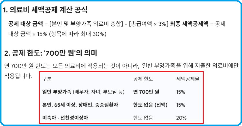 ÀÇ·áºñÀÇ °øÁ¦À²Àº ÀÇ·áºñ ÁöÃâ¾× Áß Ãѱ޿©¾×ÀÇ 3%¸¦ ÃʰúÇÏ´Â ±Ý¾×¿¡ ´ëÇØ 15% ¼¼¾×°øÁ¦¸¦ ÇÑ´Ù. ÀÏ¹Ý ºÎ¾ç°¡Á· ÀÇ·áºñ´Â ¿¬ 700¸¸ ¿ø Çѵµ´Ù. º»Àΰú ºÎ¾ç°¡Á·ÀÌ 65¼¼ ÀÌ»óÀÎ °æ¿ì¿Í Àå¾ÖÀÎÀÎ °æ¿ì¿¡´Â °øÁ¦Çѵµ°¡ ¾ø´Ù. ´ë»óÇ׸ñÀº ÁøÂû, °Ë»ç, Áúº´Ä¡·á ¸ñÀûÀÇ º´¿øºñ, ÀǾàǰ ±¸ÀÔºñ, ¾È°æ, ÄÜÅÃÆ®·»Áî ±¸ÀÔºñ(1Àδç 50¸¸ ¿ø Çѵµ), º¸Ã»±â ±¸ÀÔºñ µîÀÌ´Ù.
