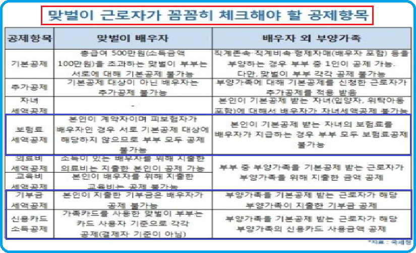 ±â¾ïÇÒ °ÍÀº º´¿ø¿¡ ÁöºÒÇÑ °£º´ºñ´Â °øÁ¦´ë»óÀÌ ¾Æ´Ï°í, ¿Ü¸ð°³¼± ¸ñÀûÀÇ ¼ºÇü¼ö¼úÀ̳ª ¹Ì¿ë ½Ã¼úºñ´Â Á¦¿ÜµÈ´Ù. º¸¾à, ºñŸ¹Î µî °Ç°­ÁõÁøÀ» À§ÇÑ ÀǾàǰ ±¸ÀÔºñ´Â Á¦¿ÜµÈ´Ù. ¿©±â¼­µµ ±â¾ïÇÒ °ÍÀº º¸Çèȸ»ç·ÎºÎÅÍ º¸Àü¹ÞÀº ½Ç¼Õº¸Çè ¼ö·É¾×Àº °øÁ¦´ë»óÀÌ ¾Æ´Ï¶ó´Â °ÍÀÌ´Ù. ¸Â¹úÀÌ ºÎºÎ´Â ¼­·ÎÀÇ ±âº»°øÁ¦ ´ë»óÀÚ(ÀÎÀû°øÁ¦)°¡ µÉ ¼ö´Â ¾øÁö¸¸ ÀÇ·áºñ¸¸Å­Àº ¿¹¿Ü·Î ¼ÒµæÀÌ ÀÖ´Â ¹è¿ìÀÚ¸¦ À§ÇØ ÁöÃâÇÑ ÀÇ·áºñ´Â ÁöÃâÇÑ º»ÀÎÀÌ °øÁ¦¹ÞÀ» ¼ö ÀÖ´Ù.