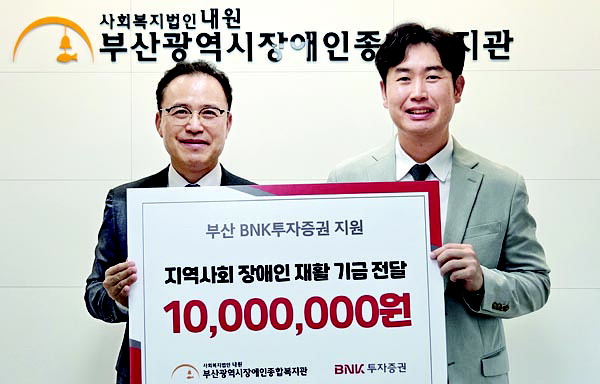 BNKÅõÀÚÁõ±Ç(´ëÇ¥ÀÌ»ç ½Å¸íÈ£)Àº ÃÖ±Ù ºÎ»ê½ÃÀå¾ÖÀÎÁ¾ÇÕº¹Áö°ü(°üÀå À̽ÂÈñ)¿¡ Àå¾ÖÀÎ º¹Áö ±ÇÀÍ ÁõÁøÀ» À§ÇÑ ±âºÎ±Ý 1000¸¸ ¿øÀ» Àü´Þ(»çÁø)Çß´Ù°í 14ÀÏ ¹àÇû´Ù.