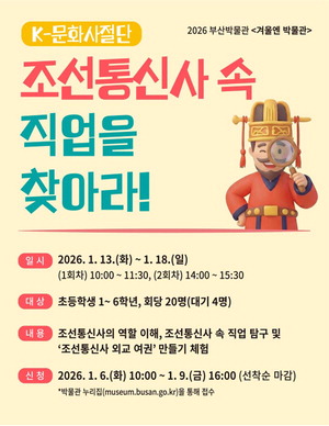 ºÎ»ê½Ã¸³¹Ú¹°°üÀº 2026³â °Ü¿ï¿£ ¹Ú¹°°ü ÇÁ·Î±×·¥ ¡®ÄÉÀÌ(K)-¹®È»çÀý´Ü, Á¶¼±Åë½Å»ç ¼Ó Á÷¾÷À» ã¾Æ¶ó!¡¯(Æ÷½ºÅÍ)¸¦ ¿À´Â 13ÀϺÎÅÍ 18ÀϱîÁö ¿î¿µÇÑ´Ù.