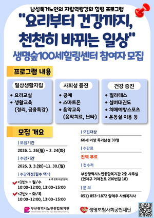Âü¿©Èñ¸ÁÀÚ´Â ³»´Þ 24ÀϱîÁö ºÎ»ê±¤¿ª½Ã³ëÀÎÁ¾ÇÕº¹Áö°ü¿¡¼­ ½ÅûÇÏ¸é µÈ´Ù. ´ë»óÀº ºÎ»ê½Ã °ÅÁÖÇÏ´Â 60¼¼ ÀÌ»ó ³²¼ºµ¶°Å³ëÀÎÀÌ´Ù. »ý¸í½£100¼¼Èú¸µ¼¾ÅÍ´Â 3¿ùºÎÅÍ ¾à 9°³¿ù°£ ÁøÇàÇϸç Çʼö°úÁ¤(1¹Ý ¶Ç´Â 2¹Ý ¼±ÅÃ)°ú Ãß°¡ °úÁ¤(¹®È­Ã¼Çè ¿ä¸®´ëȸ)À¸·Î ¿î¿µµÈ´Ù.(051)853-1872~3